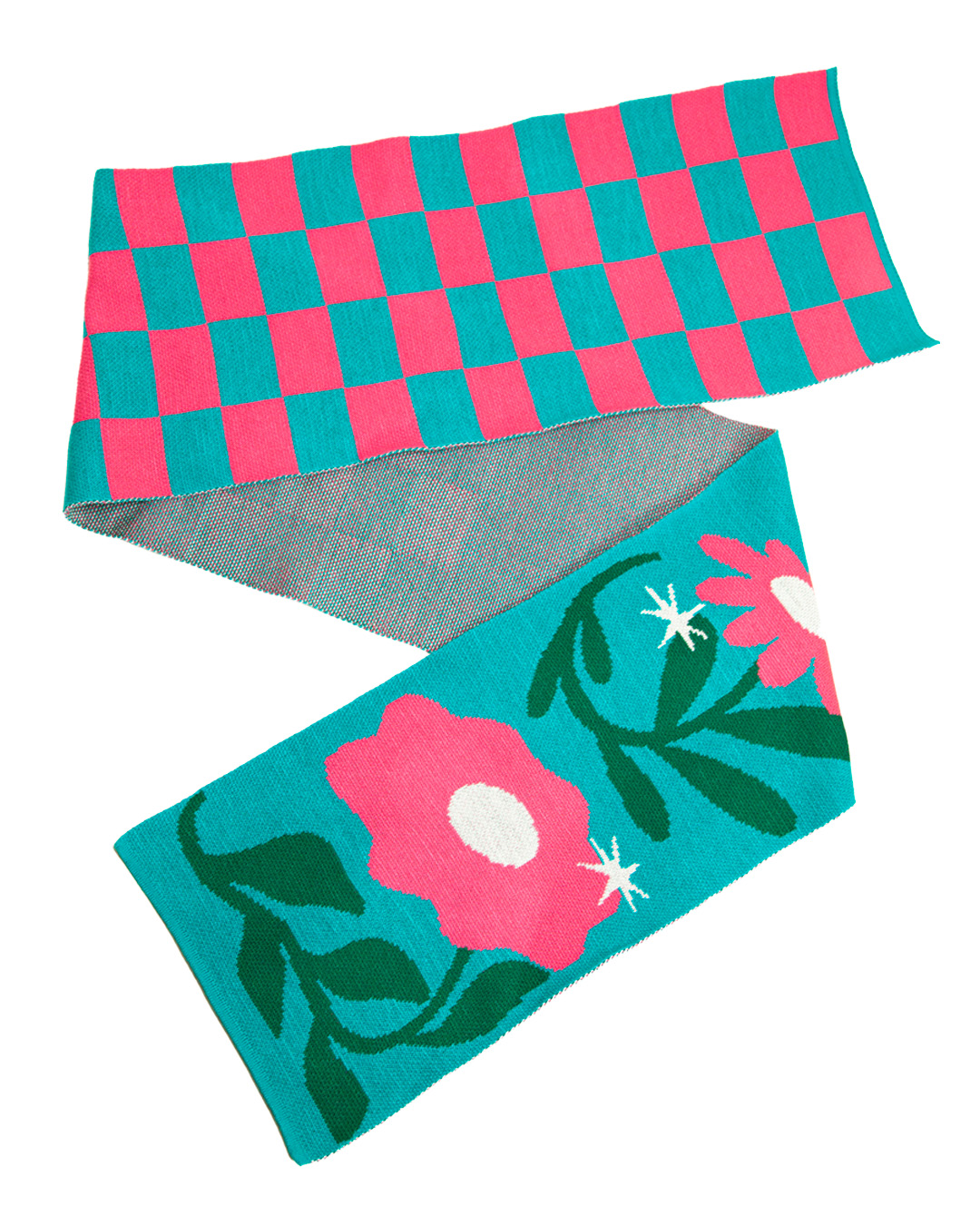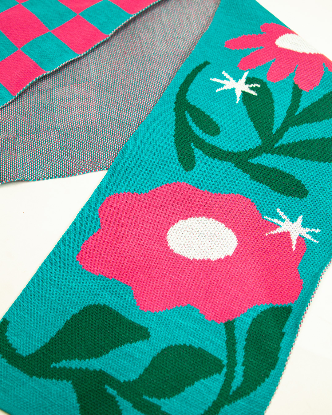 Bufanda en lana 4 colores, agua marina, verde, fucsia y blanco, mitad de flores y mitad de cuadros.