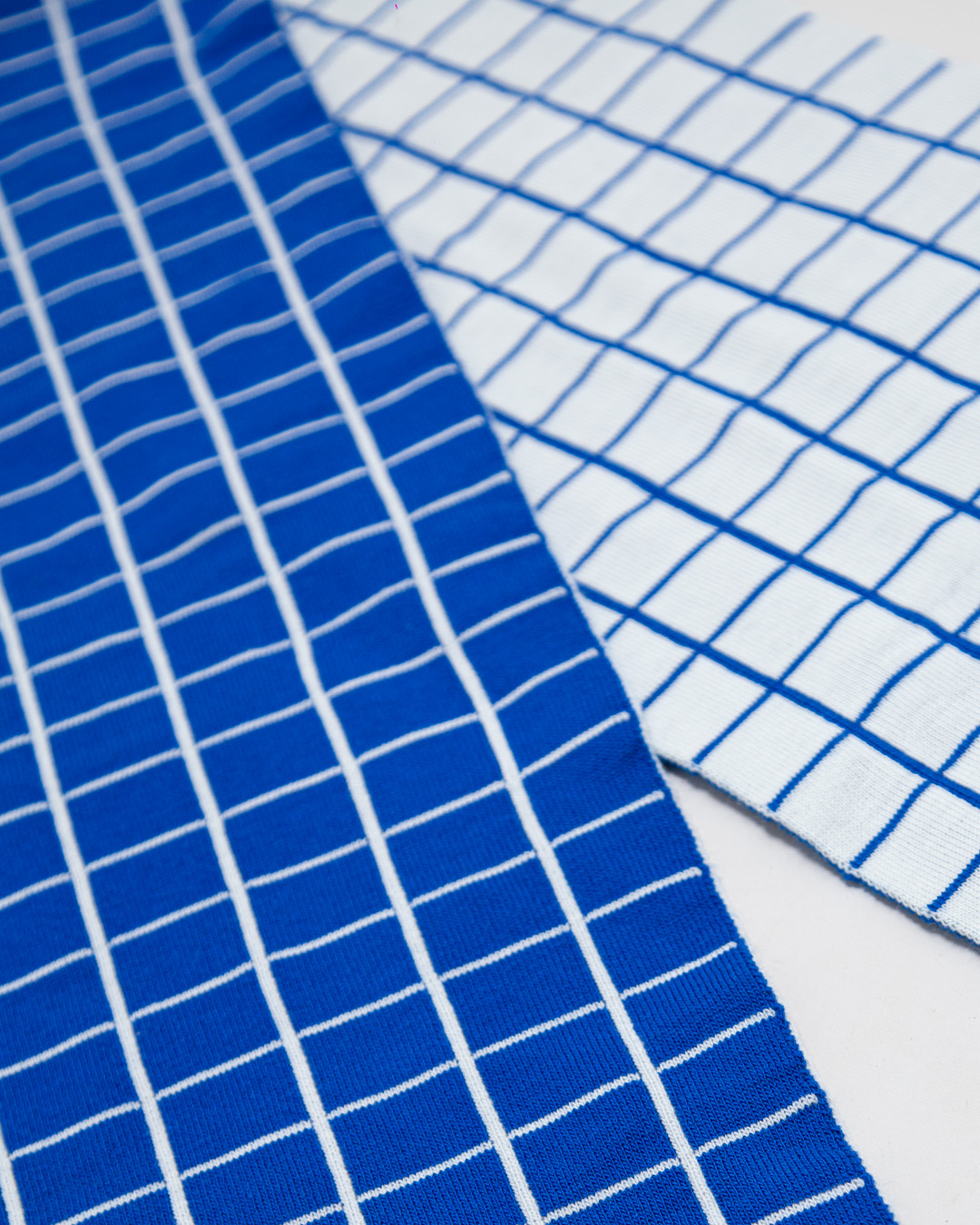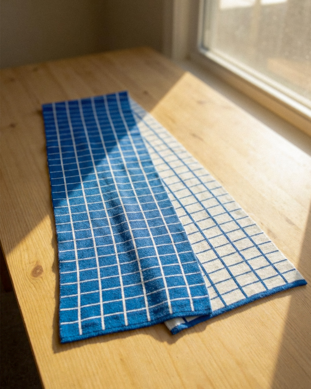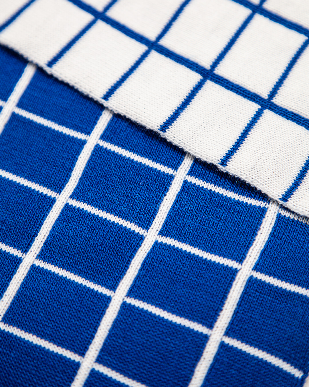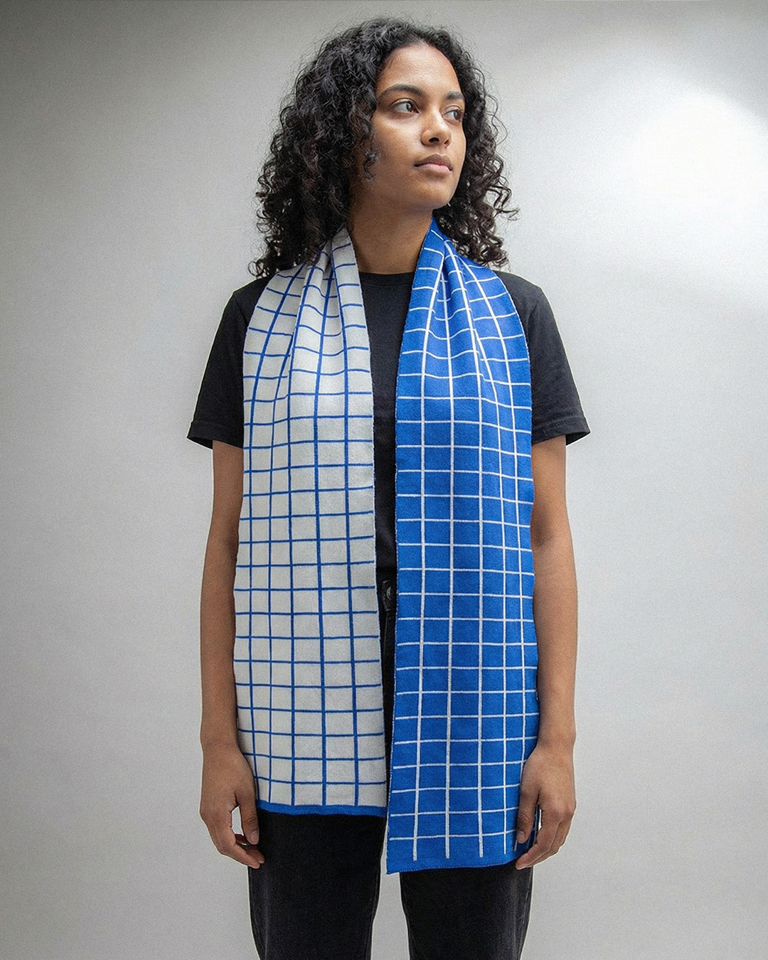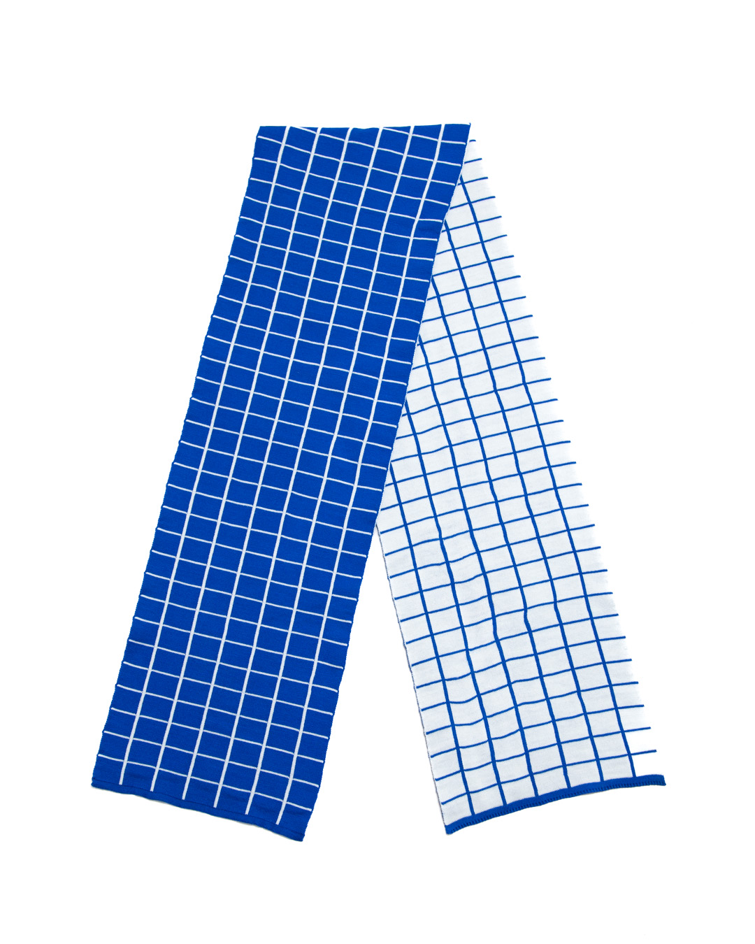 Bufanda en lana de color azul y blanco inspirada en los azulejos tradicionales.
